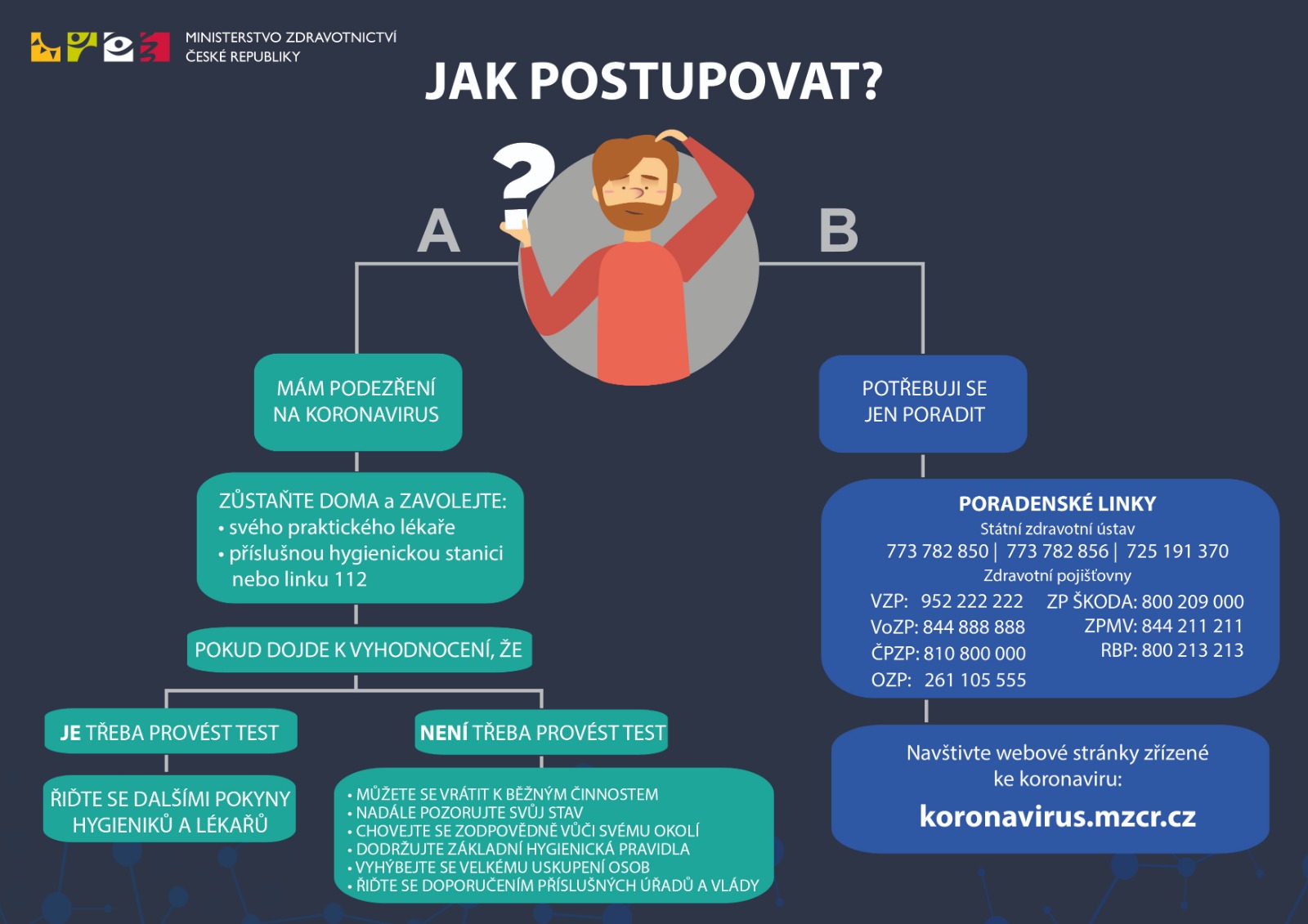 - nebo jste byli v kontaktu s osobou s prokázanou nákazou je nezbytné zůstat v izolaci doma a kontaktovat speciálně zřízenou linku 1212 či příslušnou hygienickou stanici.